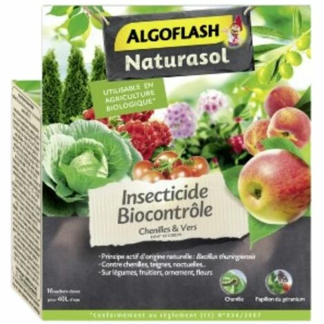 L’insecticide biologique Algoflash Naturasol << Dipel® >> est une formulation granulés dispersables contenant une bactérie : Bacillus thuringiensis ssp. Kurstaki. Ce micro-organisme synthétise des cristaux protéiques. Une fois ingérés par l’insecte, ces cristaux libèrent des toxines qui vont provoquer un arrêt de l’alimentation dans les heures qui suivent l’ingestion puis la mort de l’insecte. Cette préparation, utilisable en agriculture biologique*, permet notamment de protéger les plantes de géranium contre le papillon du géranium Cacyreus marshalli.