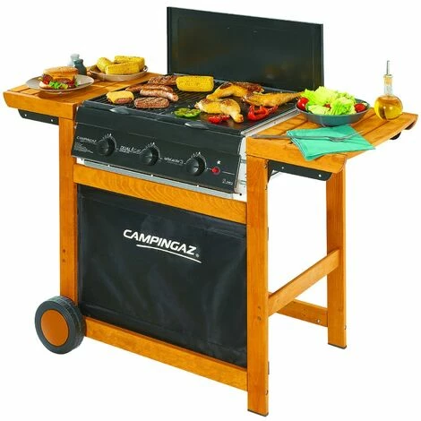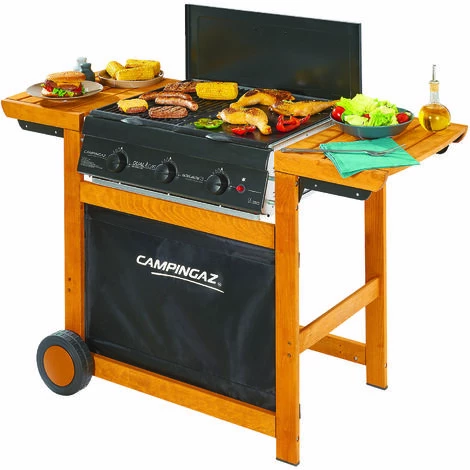Modèle à gaz sur chariot en bois de hêtre. Alimentation bi-carburant Dual Gas : Méthane/GPL. Double surface de cuisson en fonte 60×46 cm. composé d’un grill et d’une plaque, 2 étagères latérales, 3 brûleurs à allumage piezo, 2 roulettes. Taille 128x59xH88 cm.
